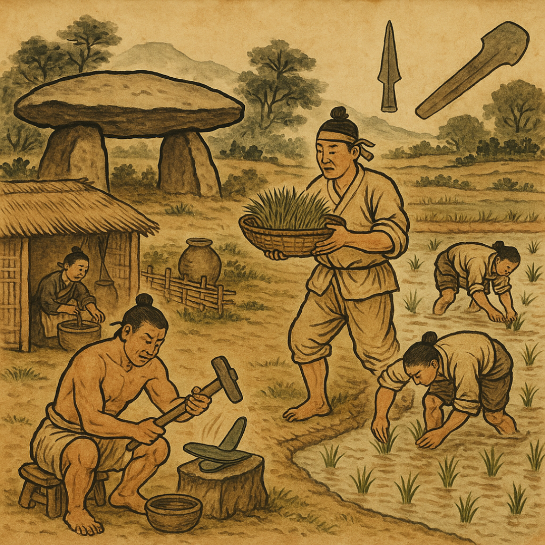- 식량 생산의 증대와 계급 사회의 출현: 신석기 시대의 밭농사를 넘어, 습한 기후에 유리한 벼농사가 일부 지역에서 시작되었습니다. 이는 식량 생산량을 획기적으로 늘려 잉여 생산물을 발생시켰고, 이 잉여 생산물을 소유하는 집단과 그렇지 못한 집단 간의 사유 재산 제도를 확립시켰습니다. 결과적으로 생산물을 더 많이 소유한 자들이 지배층으로 부상하면서 계급 사회가 본격적으로 등장했습니다.